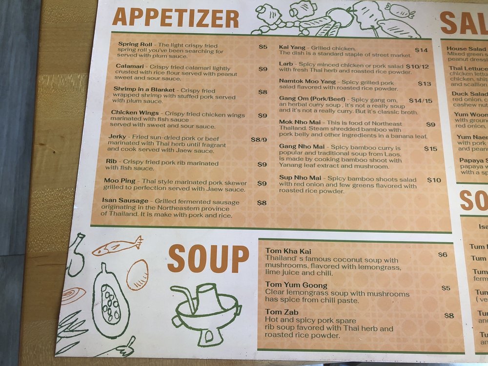 Signature dishes like Som Tum offer a spicy salad experience with choices such as salted crab or fermented fish sauce, each priced around $10. For a heartier selection, diners can savor the soulful flavors of Tom Yum soup and delicious Papaya Salad.